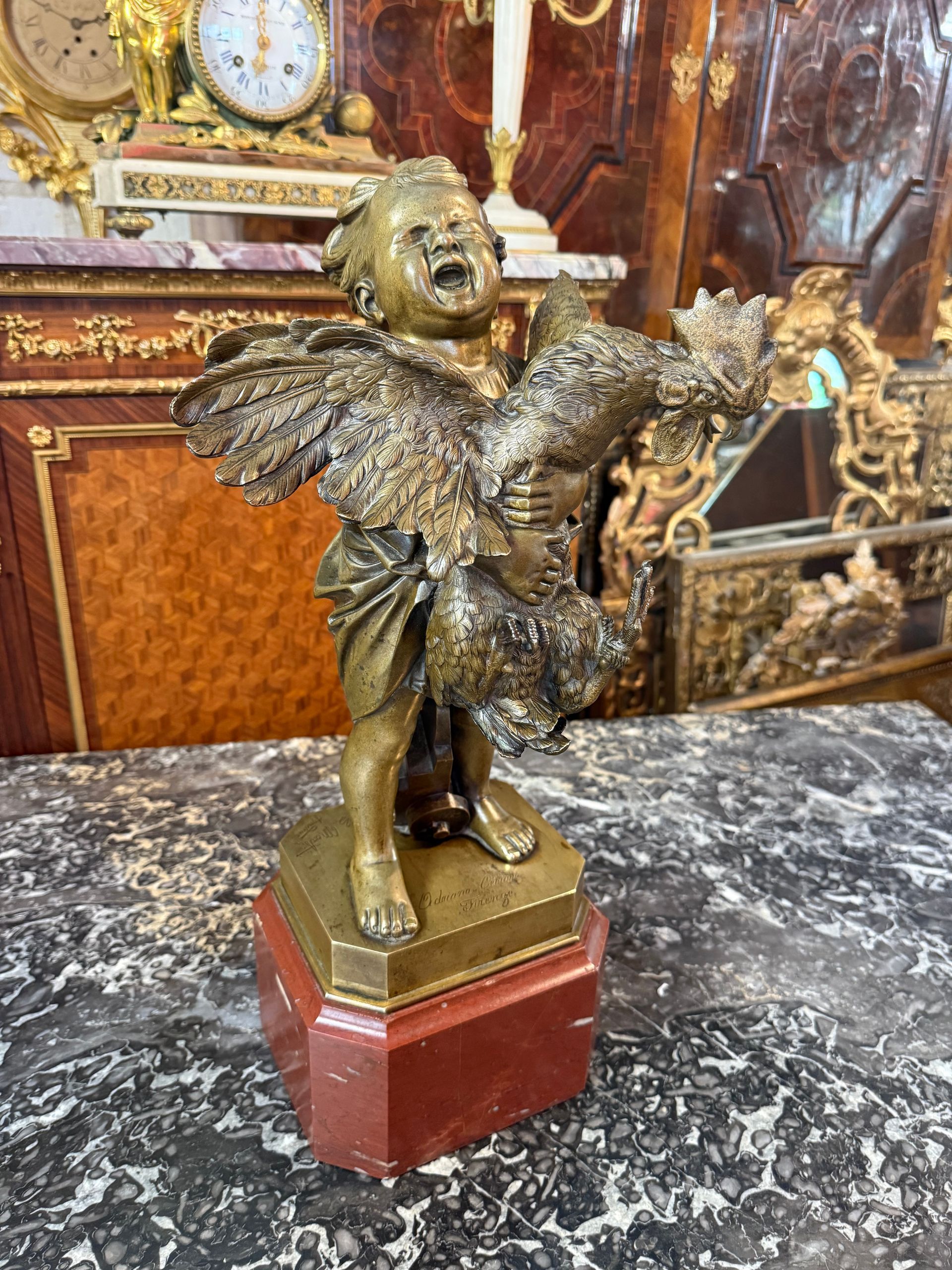 Bronze figurant l'enfant au coq sur socle en marbre rouge de griotte. Signé sur la terrasse : Adriano Cecioni Firenze. Fondeur : L . Martin. À propos : Adriano Cecioni est un peintre et unsculpteur italien du groupe des Macchiaioli. Date/Lieu de naissance : 26 juillet 1836, Florence,Italie Date de décès : 23 mai 1886, Florence,Italie