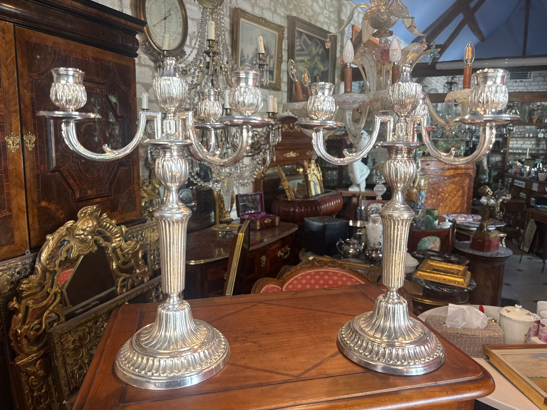 - Les candélabres sont à décor d'un putti soutenant des branche de fleurs (des roses) sur socle de marbre blanc identique à ce qui est décrit ci-dessus.