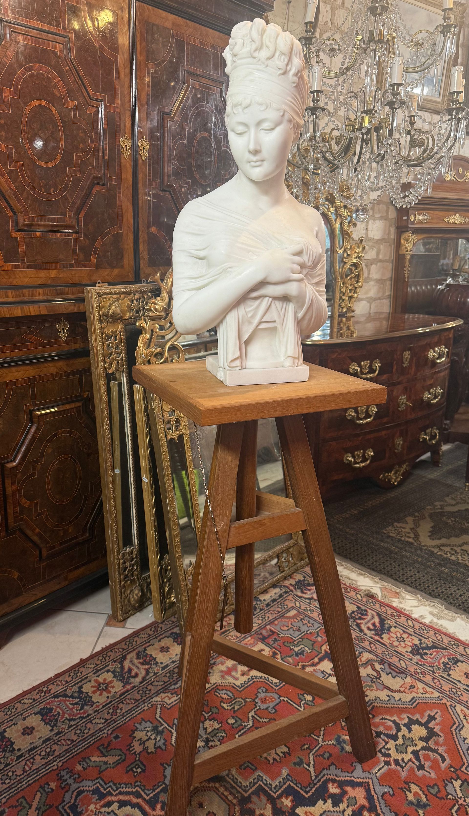 Grand buste en marbre blanc de carrare finement sculpté du 19ème, représenant Madame Récamier, Madame Récamier, au regard timide, tient dans ses mains un voile sur sa poitrine et porte dans sa coiffure un joli bandeau signé sur le piédouche : PUGI A propos de Madame RECAMIER: Jeanne Françoise Julie Adélaïde Bernard, à la ville Madame Jacques Récamier dite Juliette ou Julie Récamier, née le 3 décembre 1777 à Lyon et mortele 11 mai 1849 à Paris, est une femmede lettres française dont le salon parisien réunit, à partir du Directoire et jusqu'à la monarchie de Juillet, les plus grandes célébrités du monde politique, littéraire et artistique.