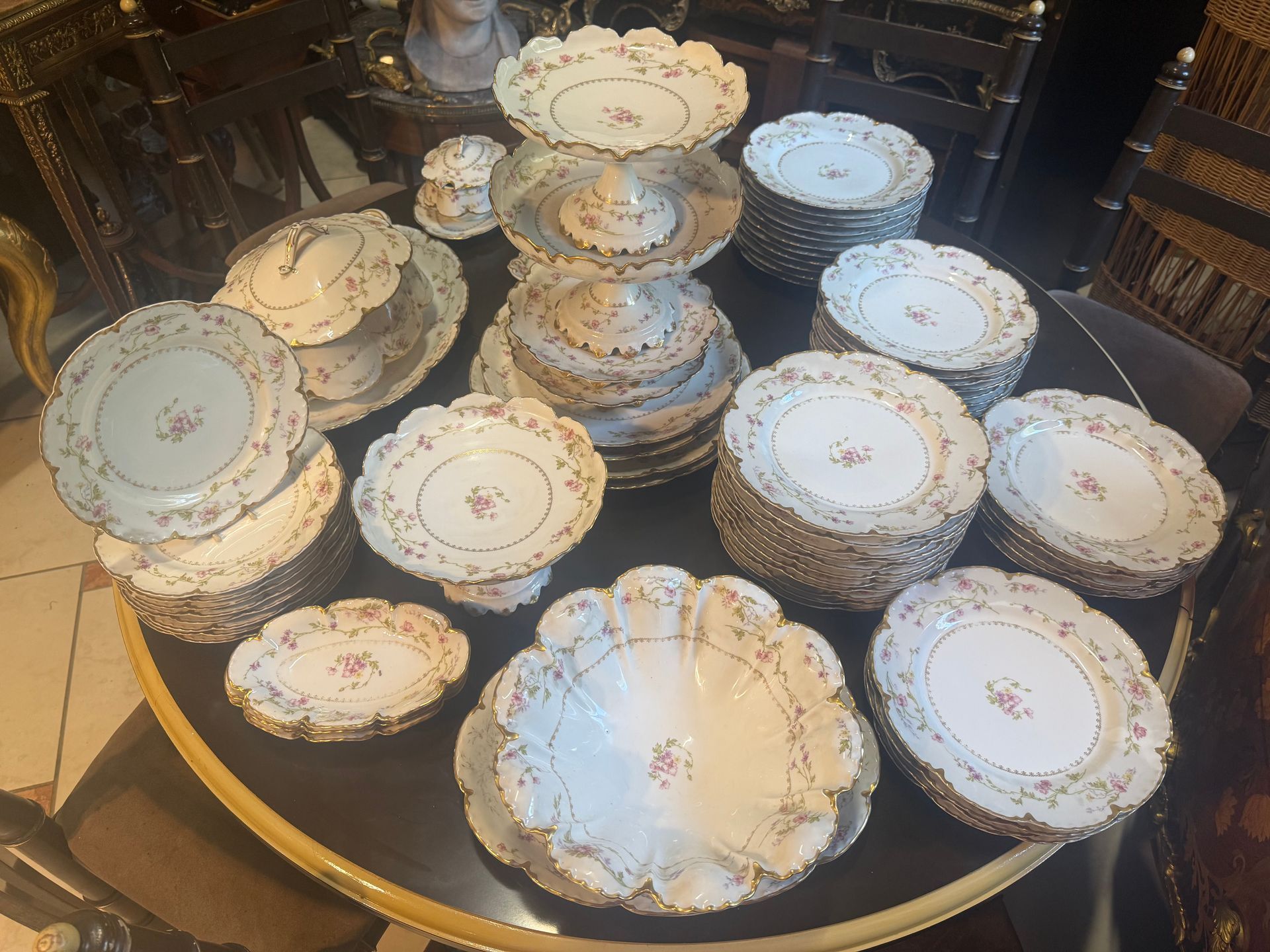 Service de table HAVILAND France, porcelaine de limoges, à décor de petites fleurs roses et bordures dorées, vintage 1900 composé de soixante-quatorze pièces, soit :