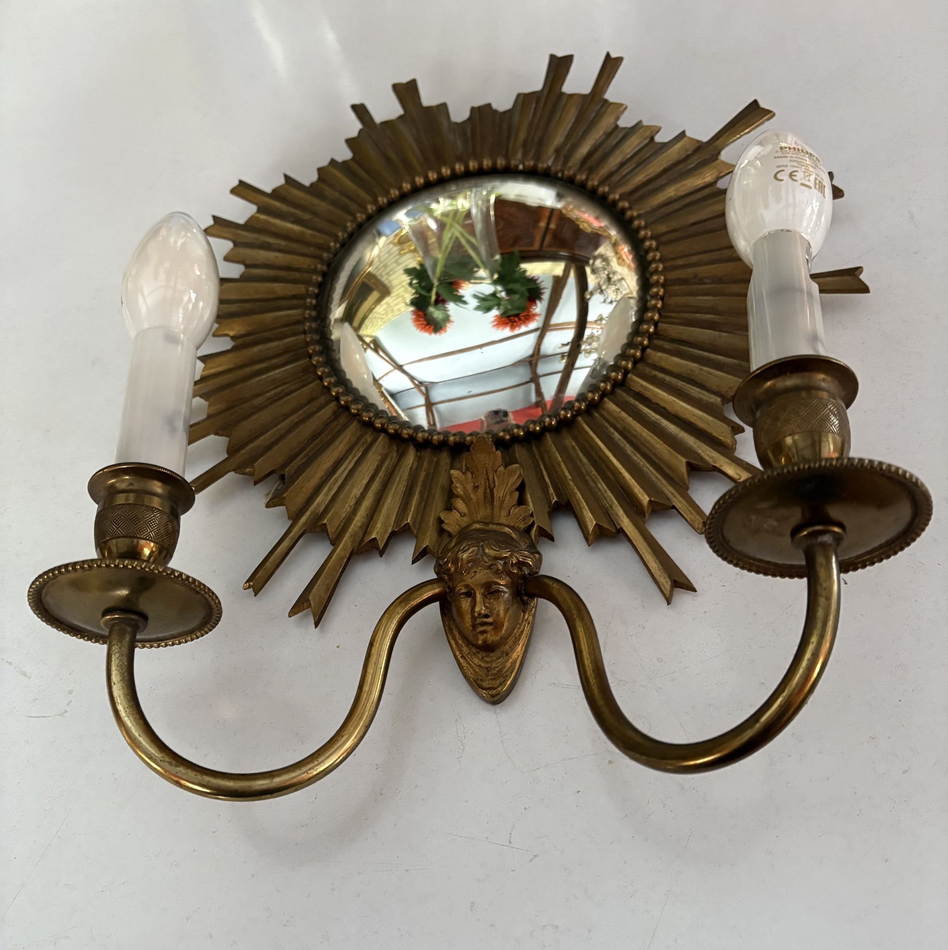 Applique formant miroir dit sorcière en forme de soleil, En bronze doré, Le cadran est pourvu d'une frise de perles, Applique présentant deux bras de lumière électrifiables, réunies par une tête de personnage, A noter q'une des bobèches présente une petite casse. Travail des années 1960 de la maison JANSEN